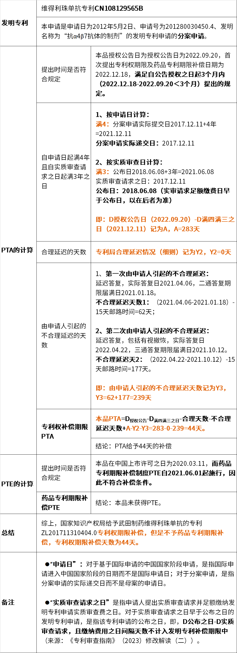 下面通過案例來更深入了解專利權(quán)期限補(bǔ)償,維得利珠單抗專利為國(guó)內(nèi)首批獲得專利權(quán)期限補(bǔ)償審批的發(fā)明專利,但未獲得藥品專利期限補(bǔ)償。