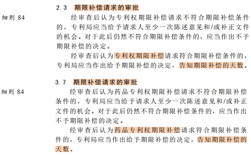 《審查指南》第五部分第九章2.3和3.7期限補(bǔ)償請(qǐng)求的審批作出如下規(guī)定,經(jīng)審查后認(rèn)為專利權(quán)期限補(bǔ)償請(qǐng)求符合期限補(bǔ)償條件的,均由專利局作出期限補(bǔ)償?shù)臎Q定,并告知期限補(bǔ)償?shù)奶鞌?shù)。