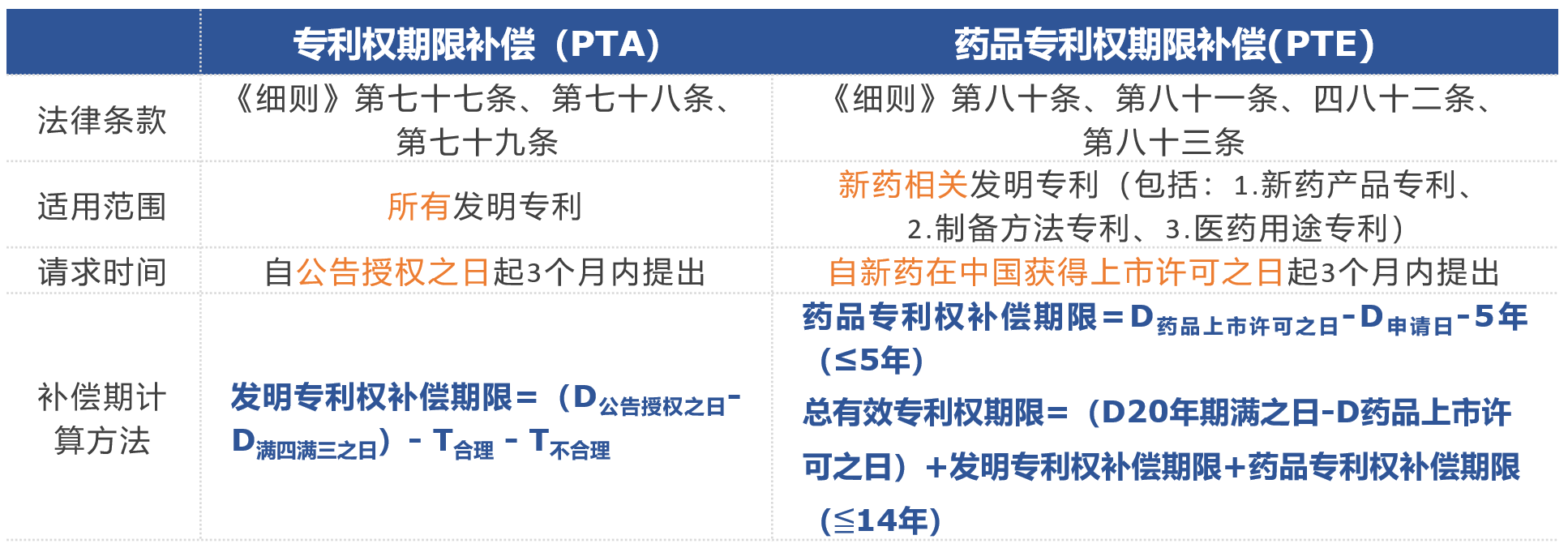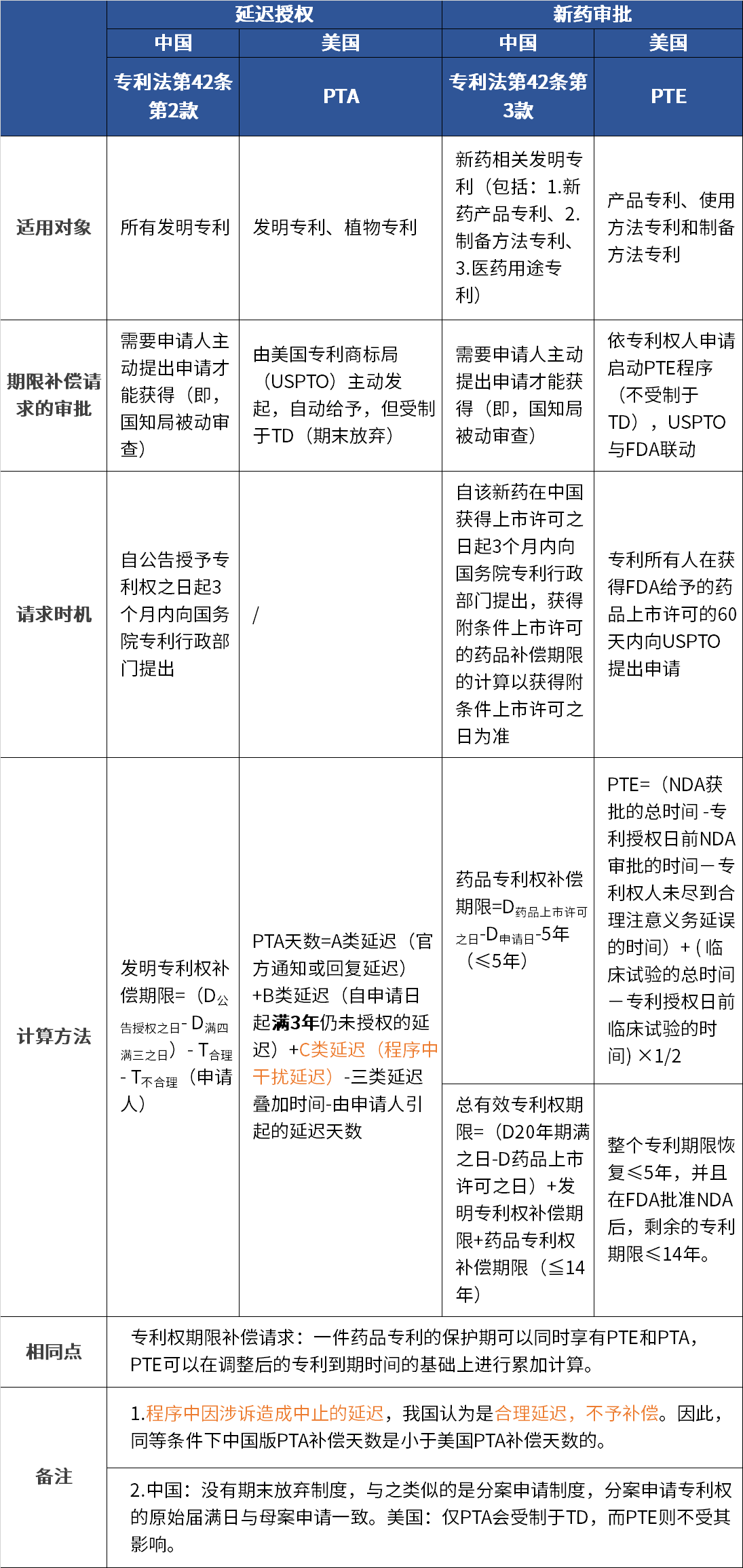 為了更直觀對(duì)比專利權(quán)期限補(bǔ)償(PTA)和藥品專利權(quán)期限補(bǔ)償(PTE)的區(qū)別,列出如下表格: