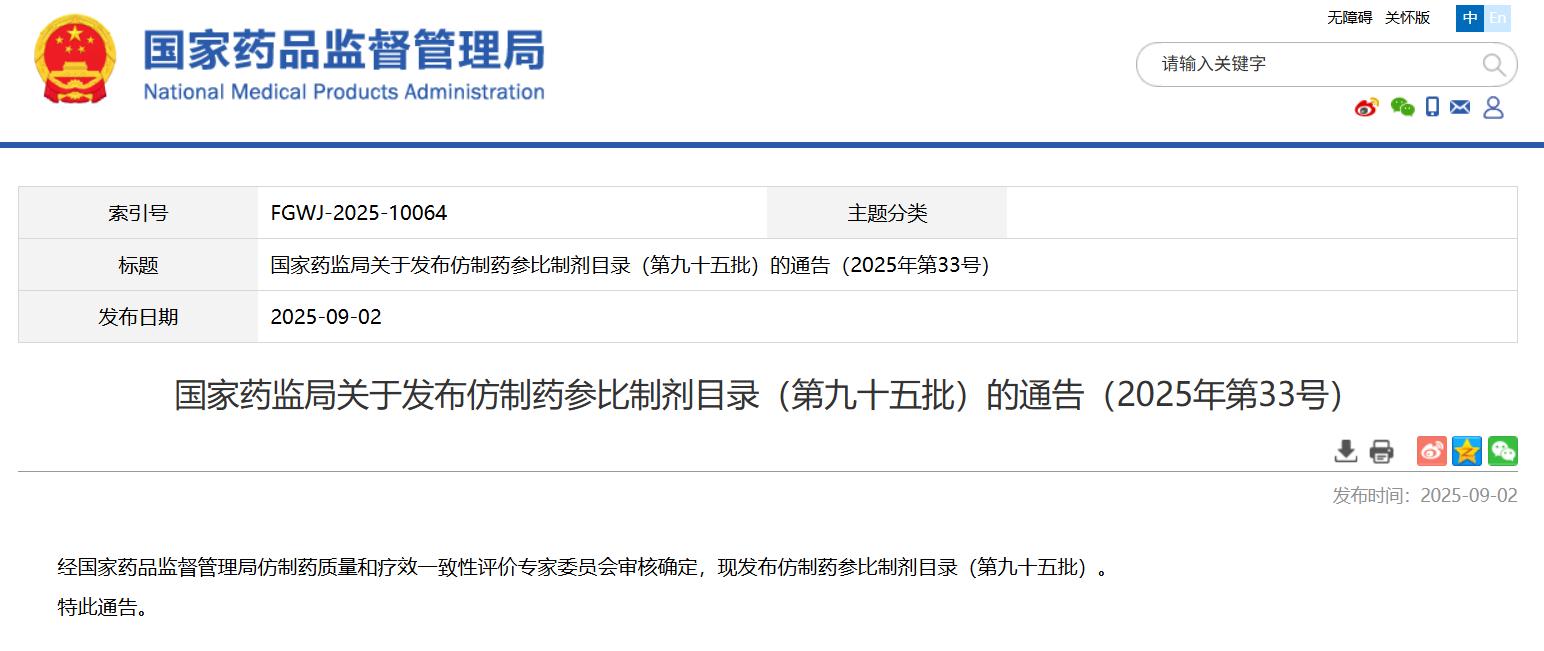國家藥監(jiān)局關(guān)于發(fā)布仿制藥參比制劑目錄(第九十五批)的通告(2025年第33號)