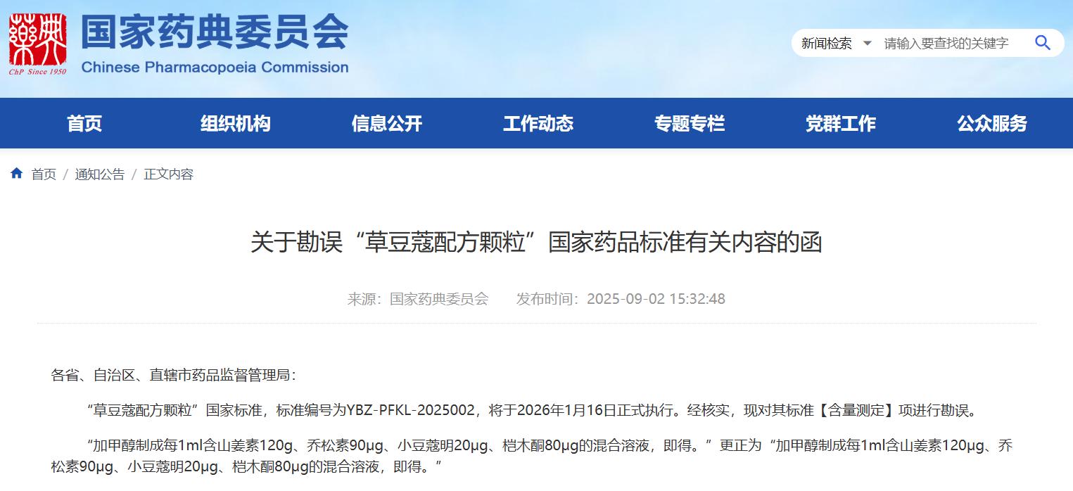 關(guān)于勘誤“草豆蔻配方顆粒”國家藥品標(biāo)準(zhǔn)有關(guān)內(nèi)容的函