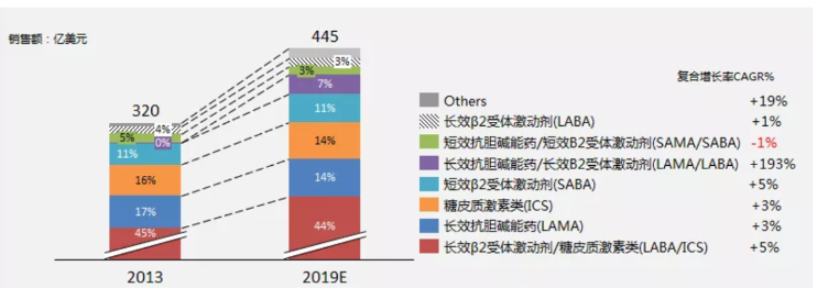 在市場(chǎng)方面,IQVIA報(bào)告顯示,2019年全球吸入制劑的市場(chǎng)份額高達(dá)480億美元,6年復(fù)合增長率為+6.99%。全球吸入制劑藥物的應(yīng)用場(chǎng)景,主要來自支氣管哮喘Asthma/慢阻肺COPD的防治(約93%市場(chǎng)份額)、肺動(dòng)脈高壓治療,以及吸入麻醉及咳嗽的運(yùn)用。