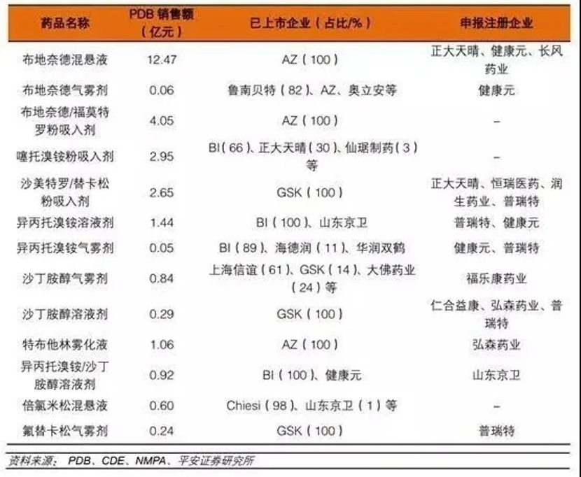 從以上數(shù)據(jù)可知,目前布地奈德混懸液、布地奈德福莫特羅粉吸入劑、沙美特羅替卡松粉吸入劑等重磅品種國內(nèi)僅原研獲批,市場(chǎng)份額完全被原研企業(yè)占據(jù)。國內(nèi)企業(yè)正在積極布局,一旦首仿成功,有望快速實(shí)現(xiàn)進(jìn)口替代。從已上市和研發(fā)布局情況來看,正大天晴、健康元、恒瑞醫(yī)藥、長風(fēng)藥業(yè)、普瑞特、山東京衛(wèi)、仙琚制藥等處于領(lǐng)先位置。