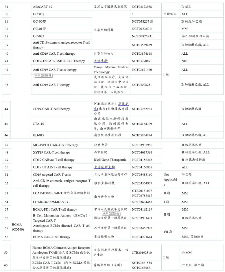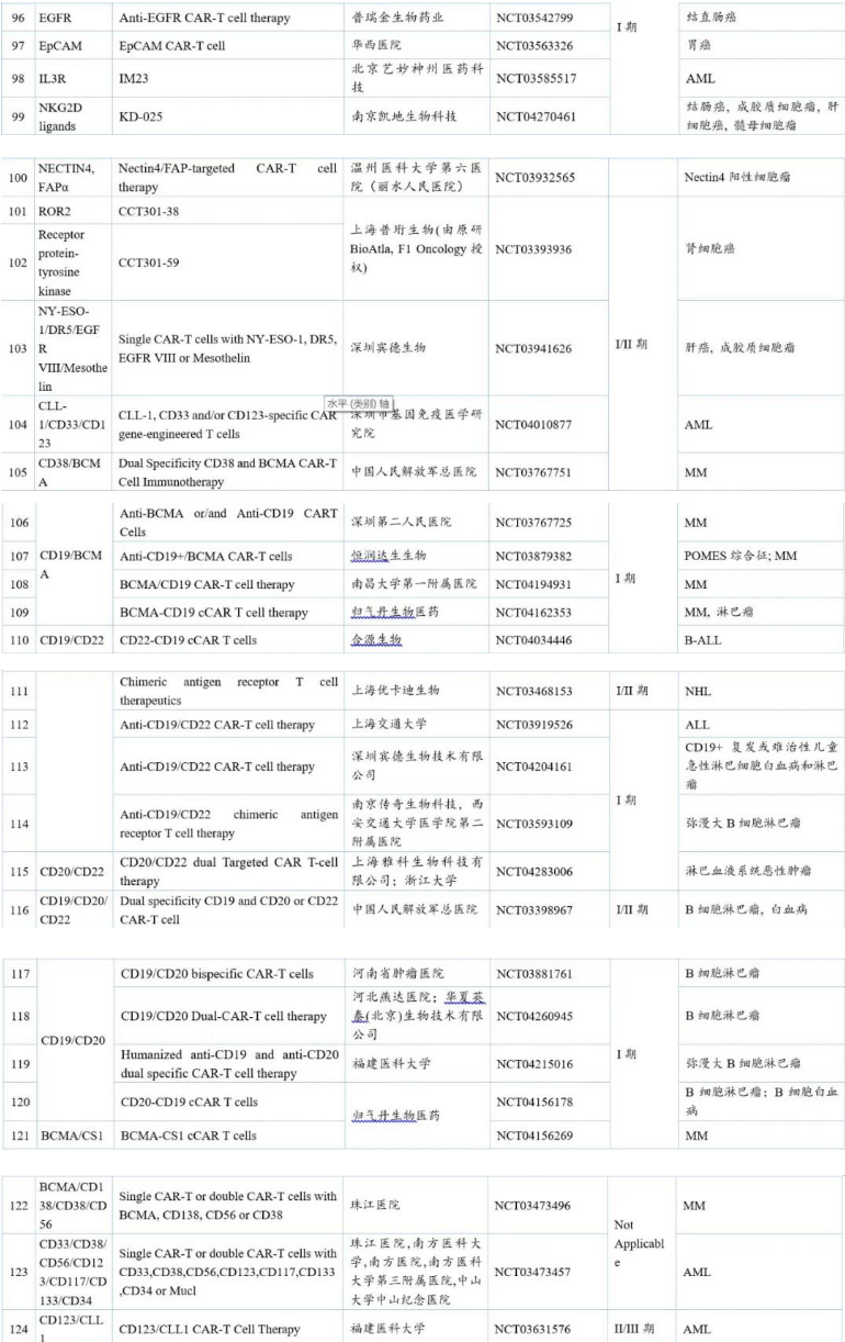 我們對(duì)上述148個(gè)臨床試驗(yàn)對(duì)應(yīng)的在研品種進(jìn)行了分析與整合,并結(jié)合國(guó)內(nèi)臨床試驗(yàn)注冊(cè)情況,最終共涉及131個(gè)CAR-T臨床在研品種,統(tǒng)計(jì)于下表中。