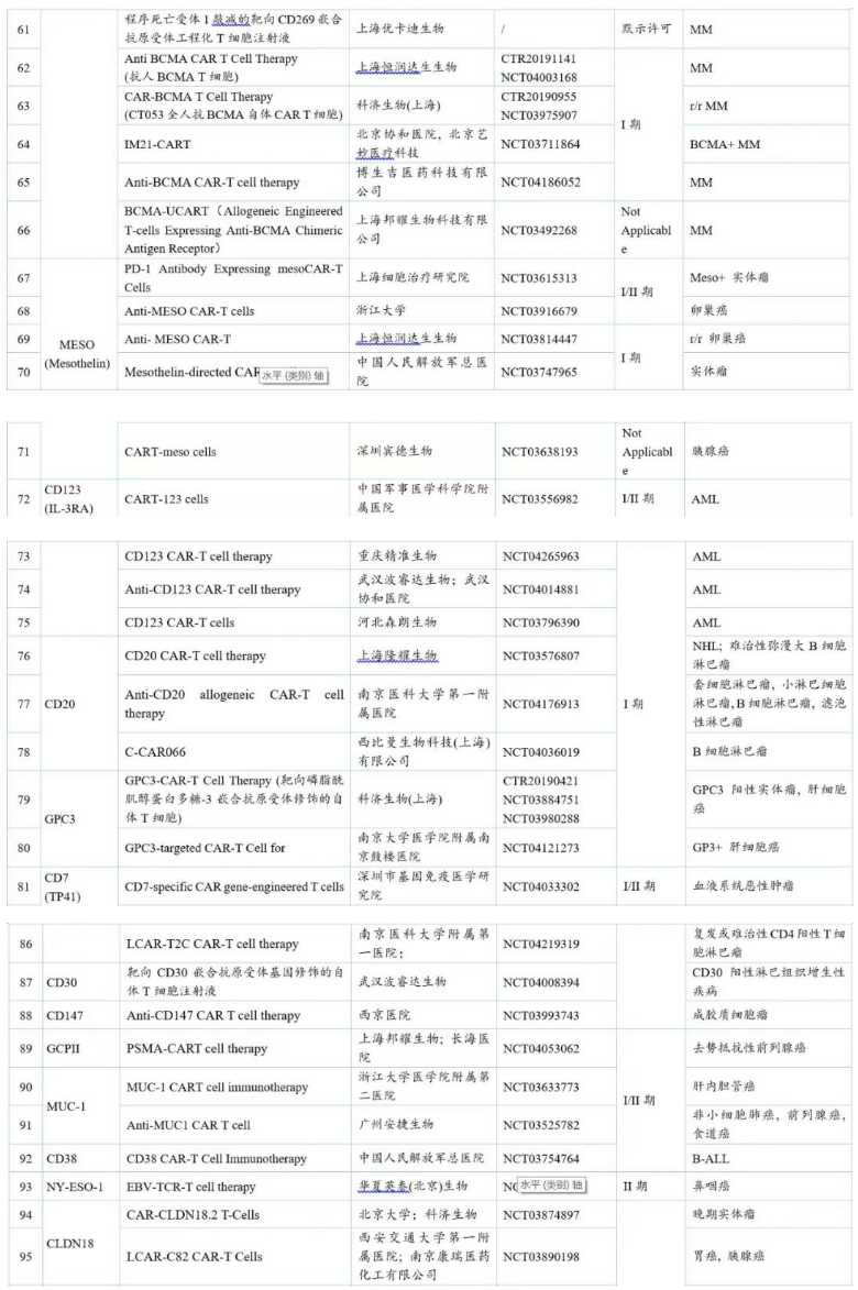 靶向Mesothelin的CAR-T品種共計(jì)5個(gè),其中進(jìn)展較快的是上海細(xì)胞治療研究院的PD-1Antibody Expressing mesoCAR-T Cells和浙江大學(xué)的Anti-MESOCAR-T cells,兩者均處于臨床I/II期。