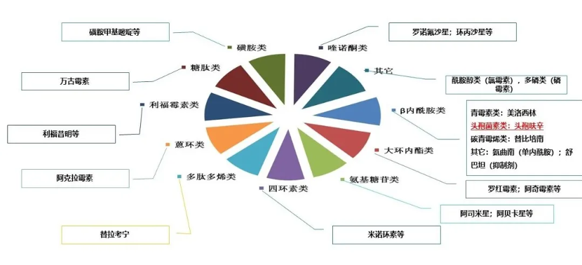 注:磺胺類及喹諾酮類是人工合成的抗感染藥物,嚴(yán)格意義上不屬于抗生素。