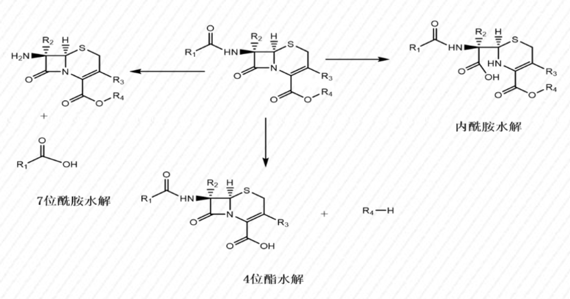 頭孢類化合物中官能團(tuán)較多,且很多官能團(tuán)穩(wěn)定性差,因此大部分頭孢類化合物,熱穩(wěn)定性、光穩(wěn)定性、酸堿穩(wěn)定性、溶液穩(wěn)定性均相對(duì)較差,對(duì)于側(cè)鏈及尾鏈中含氮原子較多結(jié)構(gòu)的頭孢化合物,容易氧化。
