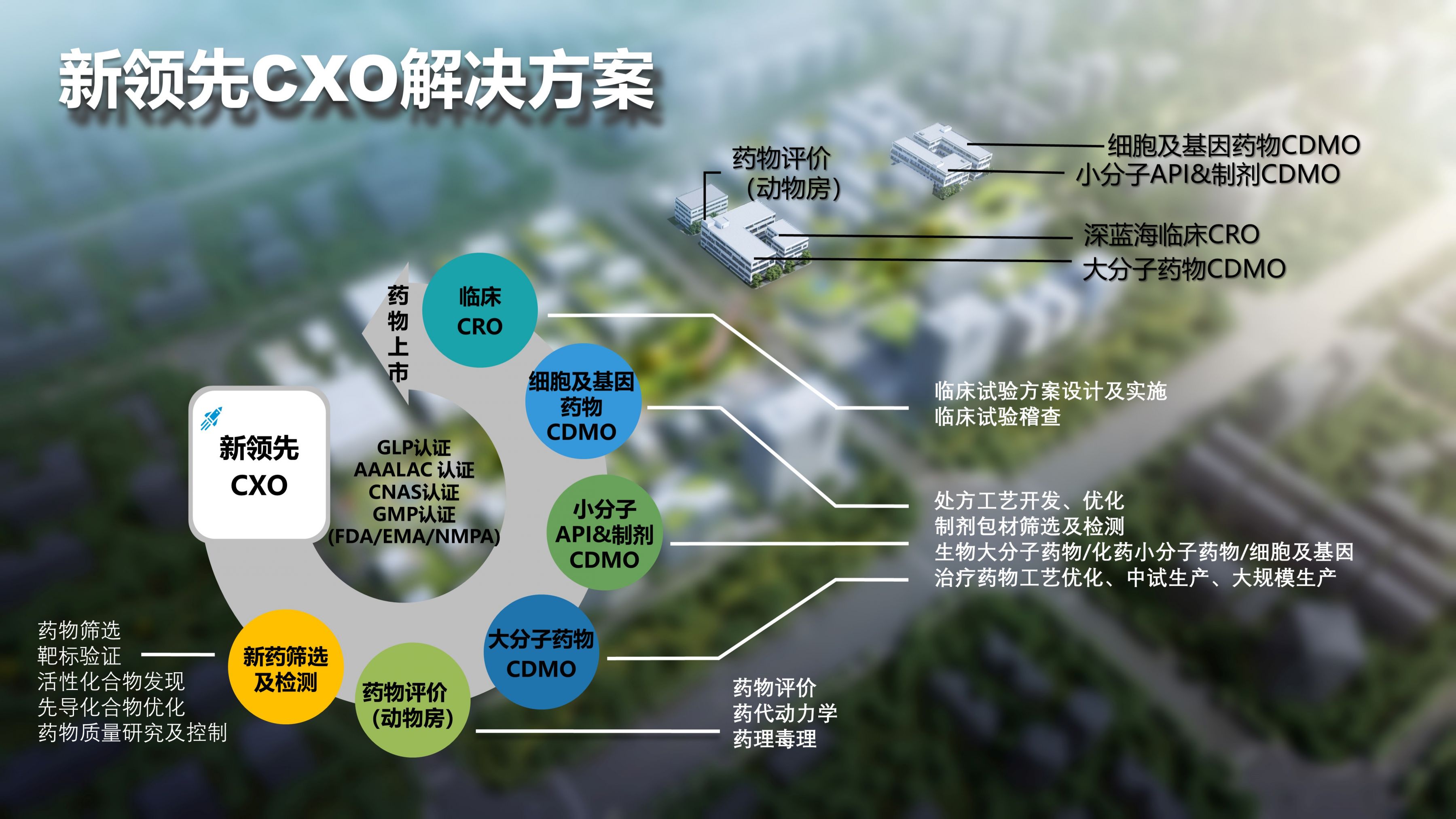公司總部位于北京中關(guān)村高新技術(shù)園區(qū),同時在鄭州臨空生物園區(qū)建立了新藥篩選及檢測平臺、藥物評價平臺(動物房,GLP、AAALAC、CNAS認證)、大分子中試及大規(guī)模生產(chǎn)服務(wù)平臺、小分子CMC制劑研究生產(chǎn)平臺、細胞技術(shù)服務(wù)平臺和臨床CRO平臺等六大符合國際標準(FDA、EMA和NMPA GMP標準)的研發(fā)平臺,形成“新領(lǐng)先CXO”全產(chǎn)業(yè)鏈服務(wù)體系。仿創(chuàng)結(jié)合,雙引擎驅(qū)動,能夠為客戶提供藥學(xué)研發(fā)全生命周期的多元化服務(wù)。