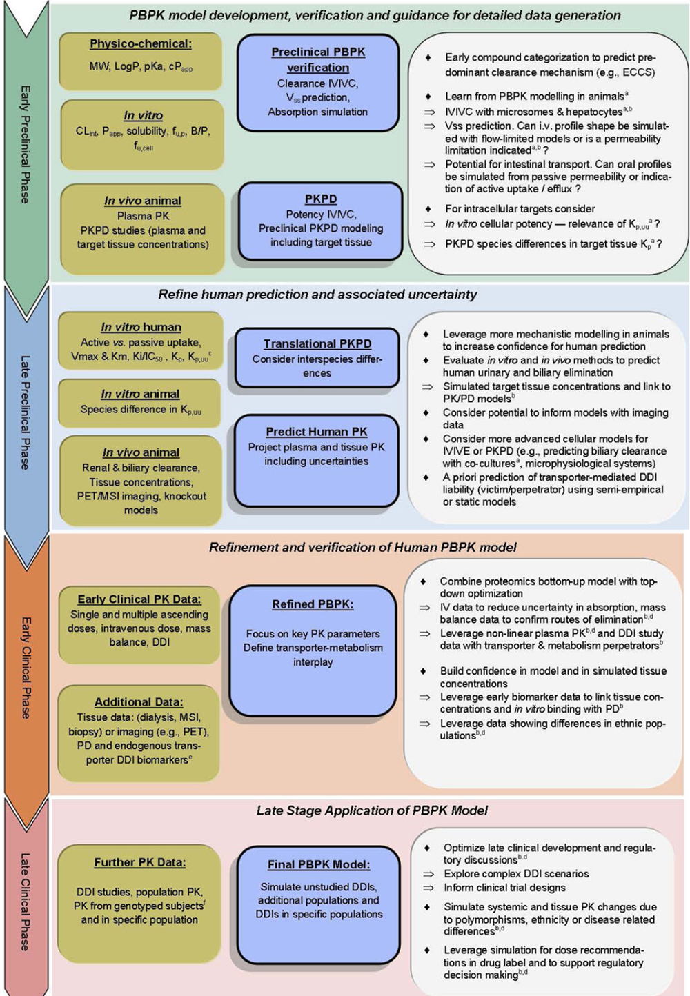 因?yàn)樵谀承┨囟ńM織器官中,該模型使用了特定的參數(shù)和微分方程,這也使得在一些藥物并用或聯(lián)合給藥治療的情況下,可以去預(yù)測(cè)有無(wú)誘導(dǎo)劑或抑制劑存在情形的特殊族群藥代動(dòng)力學(xué)特點(diǎn),這為其在新藥研發(fā)策略的提供、臨床試驗(yàn)方案的設(shè)計(jì)和臨床試驗(yàn)成功率的提高方面提供了重要參考價(jià)值和指導(dǎo)意見。來(lái)自禮來(lái),默克,羅氏等國(guó)際制藥先端企業(yè)的科學(xué)家也為PBPK建模在公司新藥研發(fā)應(yīng)用的流程做出了詳細(xì)歸納和總結(jié)[4]。