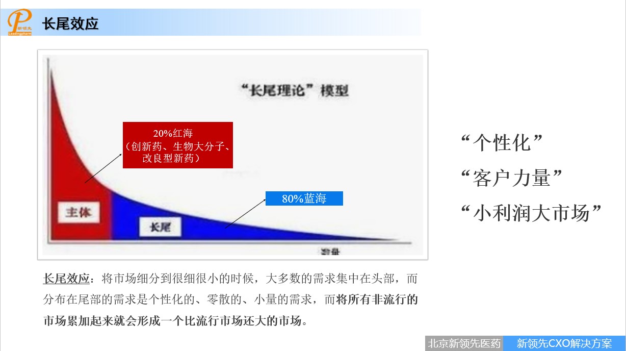 值得關(guān)注的是,此次“新領(lǐng)先CXO生態(tài)圈”又有了新的延伸。陶總講到,隨著一致性評價(jià)和集采的開展,企業(yè)的研發(fā)需求更加單元化、碎片化,出現(xiàn)了“長尾效應(yīng)”。主流市場、主流客戶、主流技術(shù)、一類創(chuàng)新等是需求曲線的頭部,但由于賽道擁擠,成為了“二八”理論中20%的頭部紅海。而例如注冊IND服務(wù)、包材相容性服務(wù)、雜質(zhì)合成服務(wù)、高通量化合物篩選、先導(dǎo)化合物優(yōu)化、動物疾病模型夠建、安全性評價(jià)、CMO服務(wù),甚至立項(xiàng)服務(wù)、投融資服務(wù)等成本較低,能夠快速與其自身技術(shù)作結(jié)合的單元化的技術(shù)需求,則成為80%的尾部藍(lán)海。