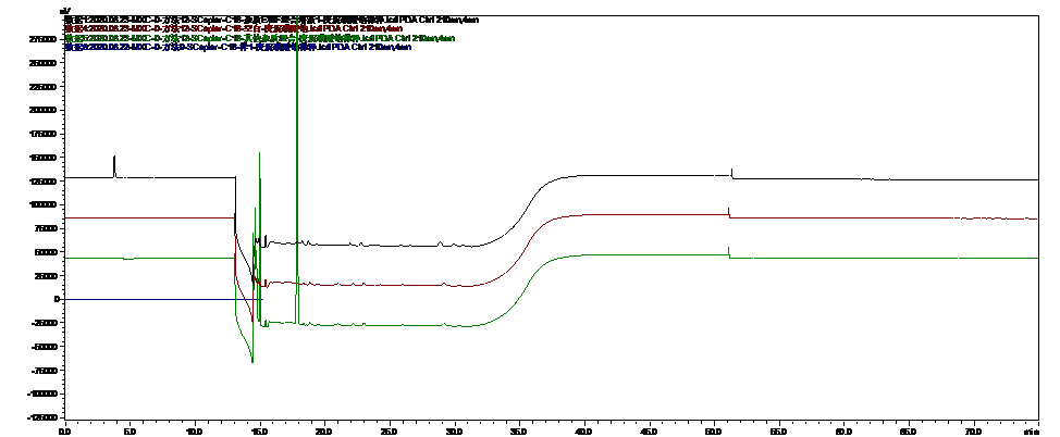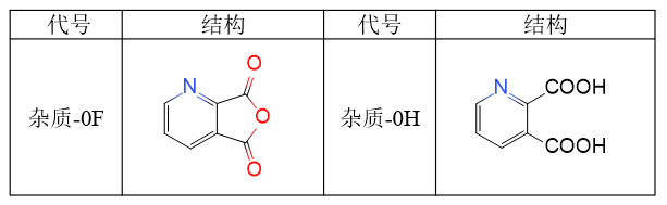 有關(guān)物質(zhì)方法Ⅱ:主要檢測雜質(zhì)-0F與雜質(zhì)-0H,此兩雜質(zhì)在有關(guān)物質(zhì)條件下出峰較早,干擾測定,單建方法進(jìn)行檢測。其中雜質(zhì)0F和雜質(zhì)0H極性極大,采用常規(guī)C18色譜柱基本沒有保留;雜質(zhì)0F和雜質(zhì)0H結(jié)構(gòu)中均含有N原子,在酸性的流動相條件下,這兩個化合物帶正電荷,此時采用含有庚烷磺酸鈉的流動相時,帶正電的兩個化合物會和帶負(fù)電的庚烷磺酸鈉基團(tuán)形成靜電作用,從而保留增強。