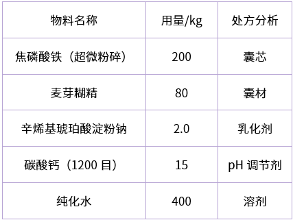 由于焦磷酸鐵在食品營(yíng)養(yǎng)強(qiáng)化中用途廣用量大,結(jié)合工業(yè)化方便、經(jīng)濟(jì)的生產(chǎn)實(shí)際特點(diǎn),本人在生產(chǎn)實(shí)踐中采用噴霧干燥法,以糖類物質(zhì)為壁材,采用微膠囊化技術(shù)對(duì)普通焦磷酸鐵原料進(jìn)行包埋處理,處理后的焦磷酸鐵性狀呈現(xiàn)小顆粒狀細(xì)粉,流散性好,加工性能(混合均勻性)得以提高,同時(shí)焦磷酸鐵經(jīng)過(guò)微膠囊化包埋處理,避免了與植物蛋白直接接觸誘發(fā)酸敗。