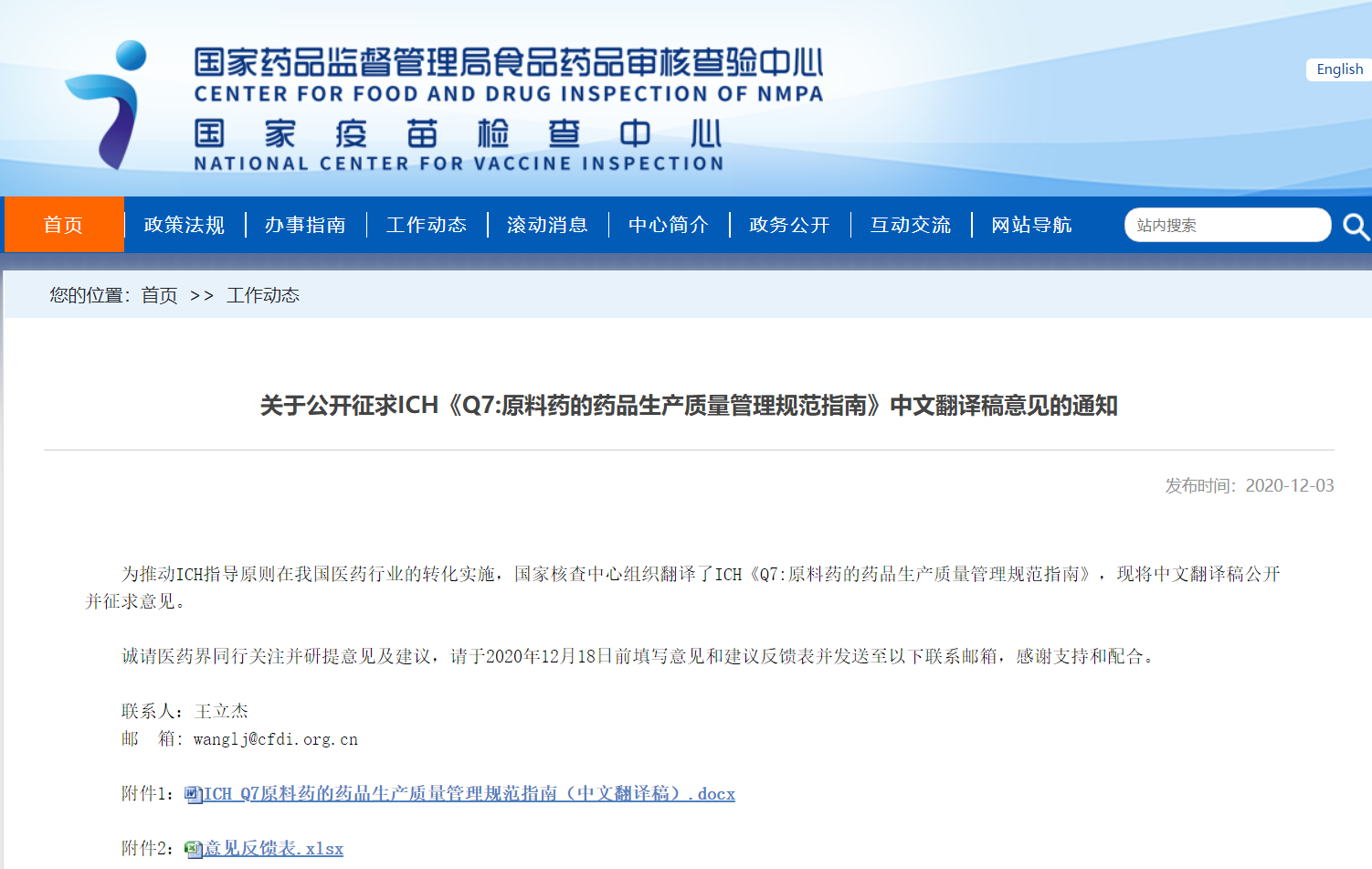 為推動(dòng)ICH指導(dǎo)原則在我國(guó)醫(yī)藥行業(yè)的轉(zhuǎn)化實(shí)施,國(guó)家核查中心組織翻譯了ICH《Q7:原料藥的藥品生產(chǎn)質(zhì)量管理規(guī)范指南》,現(xiàn)將中文翻譯稿公開(kāi)并征求意見(jiàn),時(shí)間截止至2020.12.18。