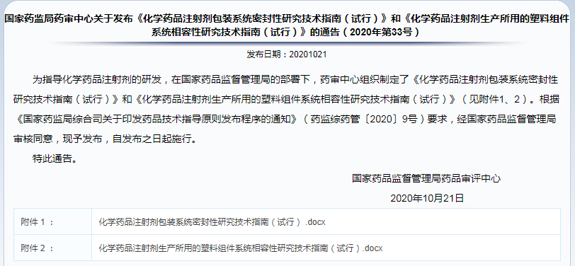 ? 國家藥監(jiān)局藥審中心關于發(fā)布《化學藥品注射劑包裝系統(tǒng)密封性研究技術指南(試行)》和《化學藥品注射劑生產所用的塑料組件系統(tǒng)相容性研究技術指南(試行)》的通告(2020年第33號)