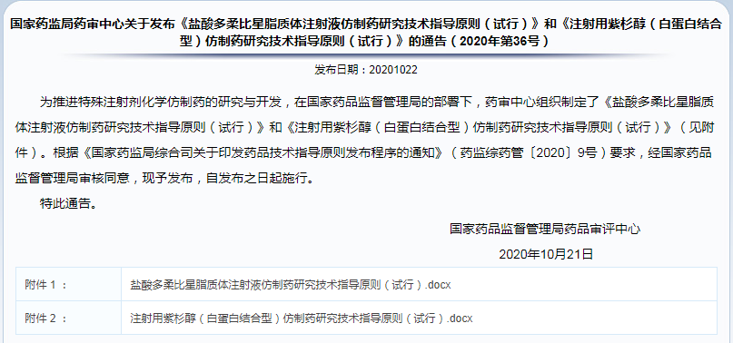 ? 國家藥監(jiān)局藥審中心關于發(fā)布《鹽酸多柔比星脂質體注射液仿制藥研究技術指導原則(試行)》和《注射用紫杉醇(白蛋白結合型)仿制藥研究技術指導原則(試行)》的通告(2020年第36號)