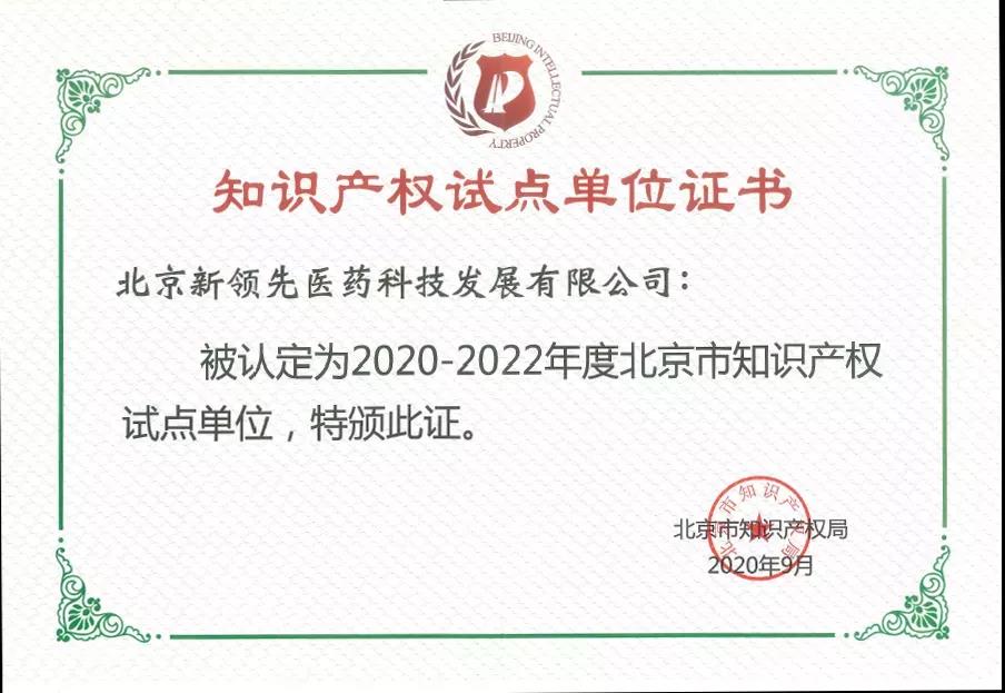 北京新領先醫(yī)藥科技發(fā)展有限公司被北京市知識產(chǎn)權局認定為“北京市知識產(chǎn)權試點單位”。此次認定是新領先繼2019年成功通過知識產(chǎn)權管理體系認證后,榮獲的又一項知識產(chǎn)權相關的榮譽資質(zhì)。