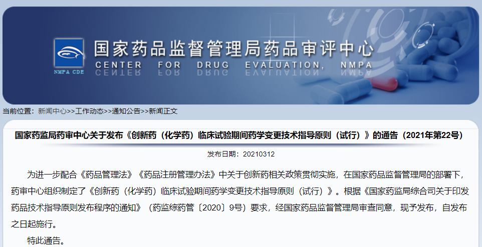 關(guān)于發(fā)布《創(chuàng)新藥(化學(xué)藥)臨床試驗(yàn)期間藥學(xué)變更技術(shù)指導(dǎo)原則(試行)》的通告(2021年第22號(hào))