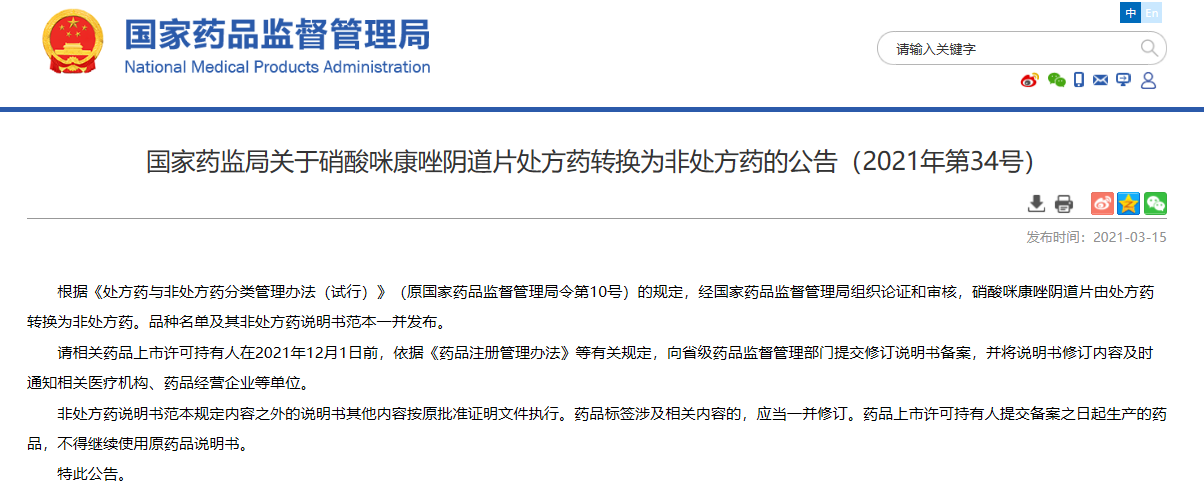 關(guān)于硝酸咪康唑陰道片處方藥轉(zhuǎn)換為非處方藥的公告(2021年第34號(hào))