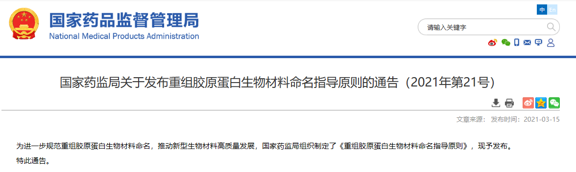 關(guān)于發(fā)布重組膠原蛋白生物材料命名指導(dǎo)原則的通告(2021年第21號(hào))