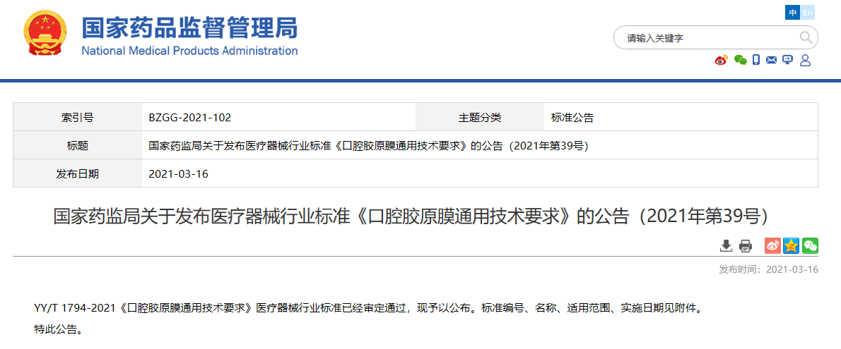 關(guān)于發(fā)布醫(yī)療器械行業(yè)標(biāo)準(zhǔn)《口腔膠原膜通用技術(shù)要求》的公告(2021年第39號(hào))