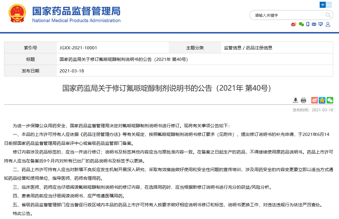 關(guān)于修訂氟哌啶醇制劑說明書的公告(2021年 第40號(hào))