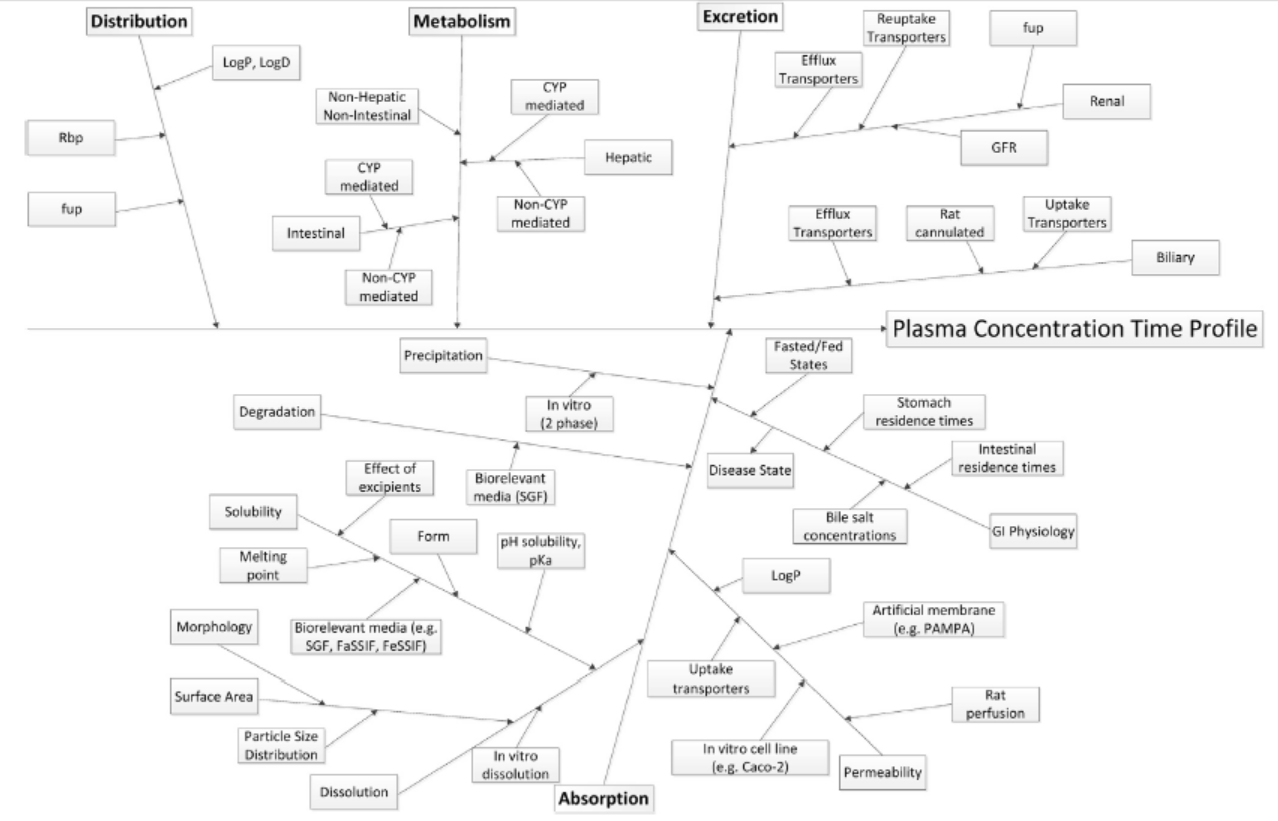 在固體制劑藥物吸收過程分析中,我們可以總結得到,影響其吸收的主要因素包括人體生理學特征,藥物原輔料的理化性質,和制劑工藝三個主要方面的因素,此外受試者年齡,性別,種群和其他因素也會對藥物的體內吸收行為發(fā)生影響。如圖3,Mohammed S.Alqahtani等科學家在文獻中匯總了藥物吸收過程的影響因素[2]。進一步地,Filippos Kesisoglou等科學家進行了更為詳細的總結,在圖4中全面匯總了藥物在人體內吸收,分布,代謝,排泄全命運周期的關聯(lián)因素和影響因子[3]。