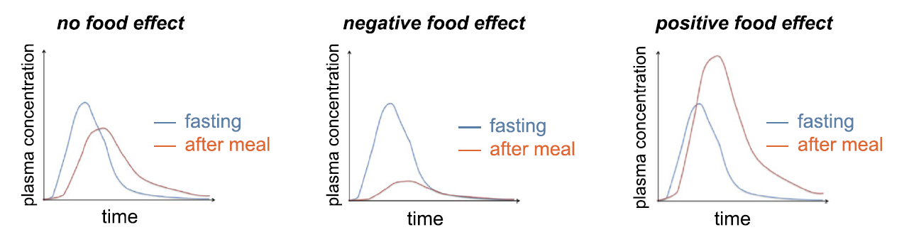 提及生理學因素對藥物吸收的影響,不得不提到食物對于藥物吸收的影響。如圖5所示,揭示了食物對于PK的三種影響狀態(tài)[4]。食物對于藥物吸收的影響機制較為綜合,涉及腸胃道pH值的變化,膽汁分泌,胃排空時間和腸胃蠕動等方方面面。具體影響如下:食物改變腸胃道的酸堿性,由于進食后胃酸或胃蛋白酶分泌增加,對于酸堿環(huán)境較為敏感的藥物,會影響其溶出溶解性質,化學穩(wěn)定性等特性,進一步對其藥理藥效產生影響。高脂肪食物會降低胃腸道動力,從而減慢胃排空速率,食物改變胃腸道動力之后,對藥物的吸收會產生影響。另外,高脂餐也可以促進膽汁分泌,增加血液循環(huán)。也有研究表明,食物中的特殊蛋白質可與部分藥物結合成鹽,形成藥物蛋白復合物結構,致使藥物體內吸收分布情況發(fā)生變化,或使得減少吸收,降低生物利用度達不到治療效果,或使得吸收增強,血藥濃度超過最低毒性劑量濃度。