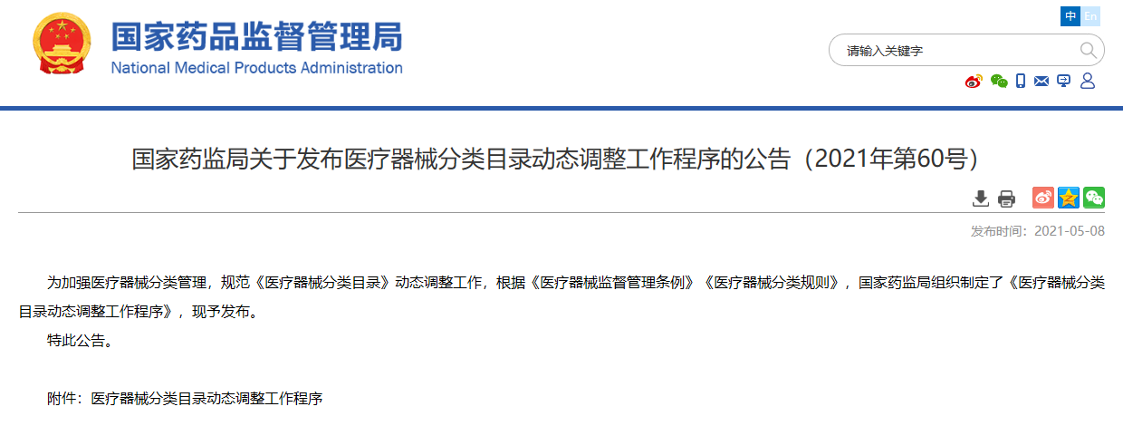關(guān)于發(fā)布醫(yī)療器械分類目錄動(dòng)態(tài)調(diào)整工作程序的公告(2021年第60號(hào))