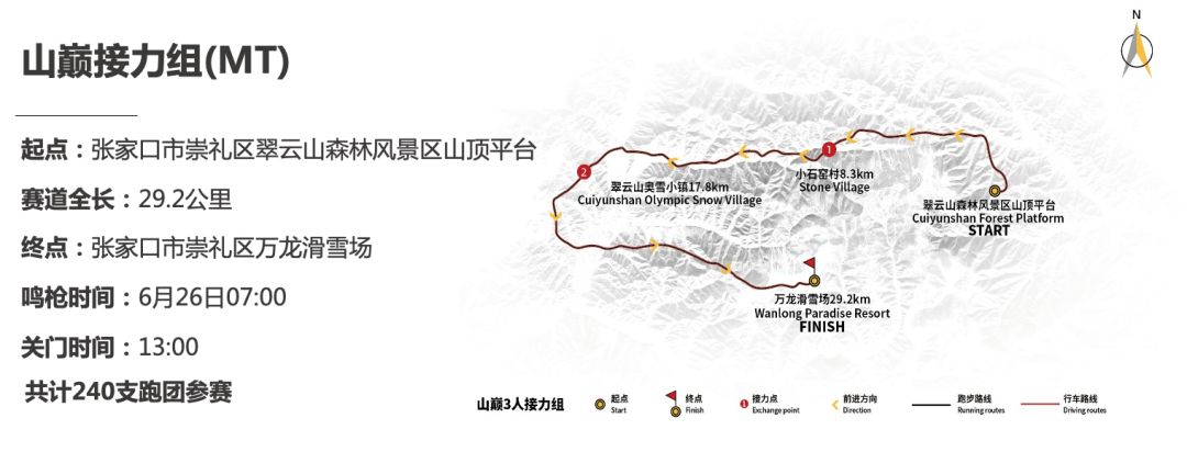 除了以上兩個組別以外,今年我們還為一直以來想體驗越山向海,但又對百公里的距離心生敬畏的跑友們開設(shè)了山巔接力組,該組別的起點位于崇禮區(qū)翠云山森林風(fēng)景區(qū)山頂平臺,終點為崇禮區(qū)萬龍滑雪場,賽道全長29.2公里,鳴槍時間為6月26日早上7點,關(guān)門時間為下午1點。