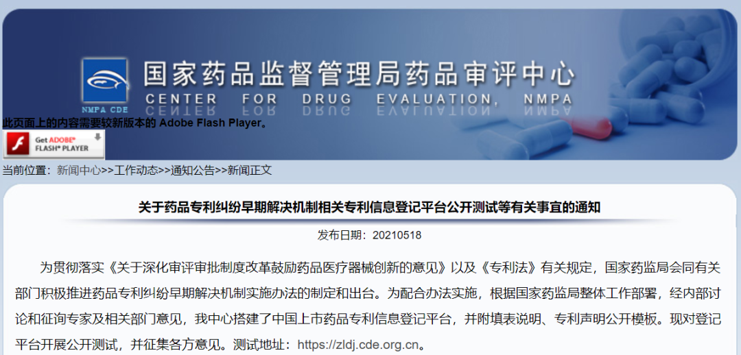 關(guān)于藥品專利糾紛早期解決機制相關(guān)專利信息登記平臺公開測試等有關(guān)事宜的通知