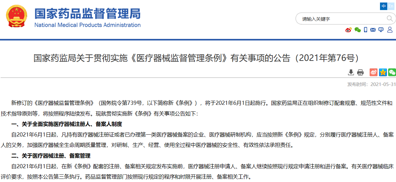 國(guó)家藥監(jiān)局關(guān)于貫徹實(shí)施《醫(yī)療器械監(jiān)督管理?xiàng)l例》有關(guān)事項(xiàng)的公告(2021年第76號(hào))