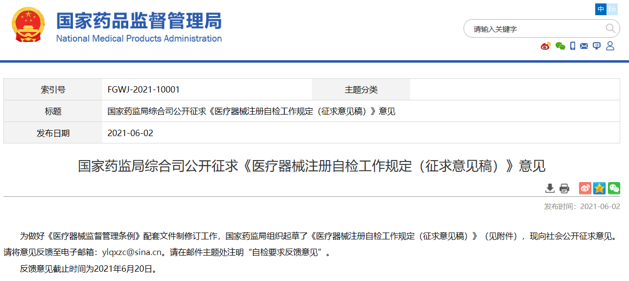 國(guó)家藥監(jiān)局綜合司公開(kāi)征求《醫(yī)療器械注冊(cè)自檢工作規(guī)定(征求意見(jiàn)稿)》意見(jiàn)
