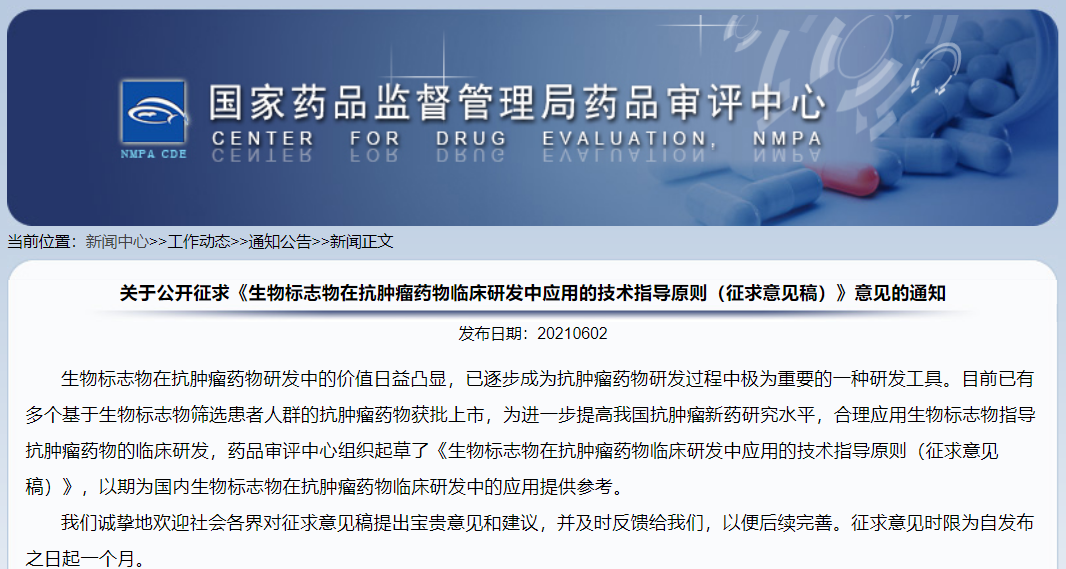 關(guān)于公開(kāi)征求《生物標(biāo)志物在抗腫瘤藥物臨床研發(fā)中應(yīng)用的技術(shù)指導(dǎo)原則(征求意見(jiàn)稿)》意見(jiàn)的通知