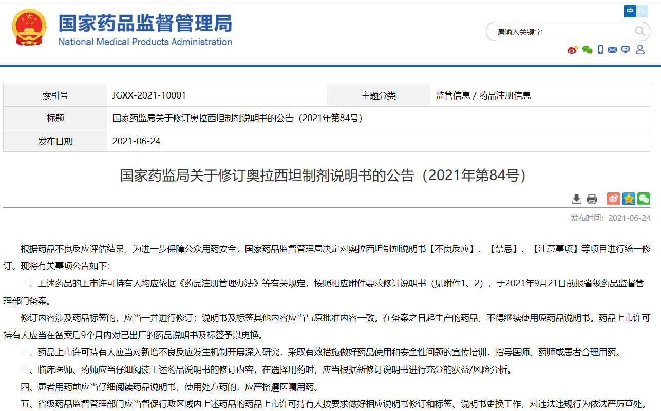 國家藥監(jiān)局關(guān)于修訂奧拉西坦制劑說明書的公告(2021年第84號)