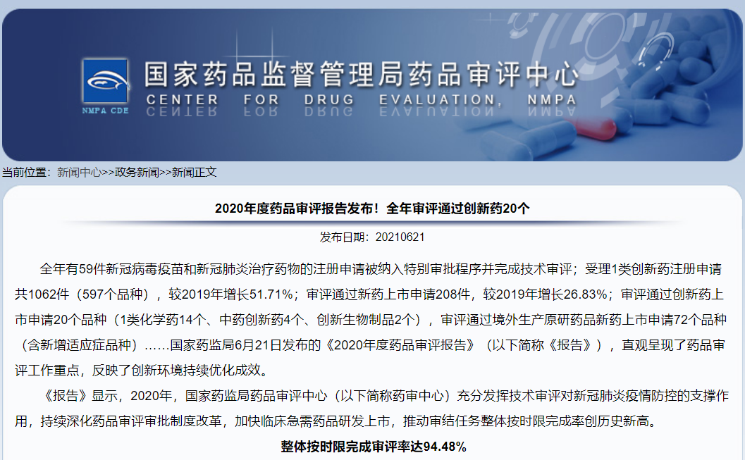 2020年度藥品審評報(bào)告發(fā)布!全年審評通過創(chuàng)新藥20個(gè)