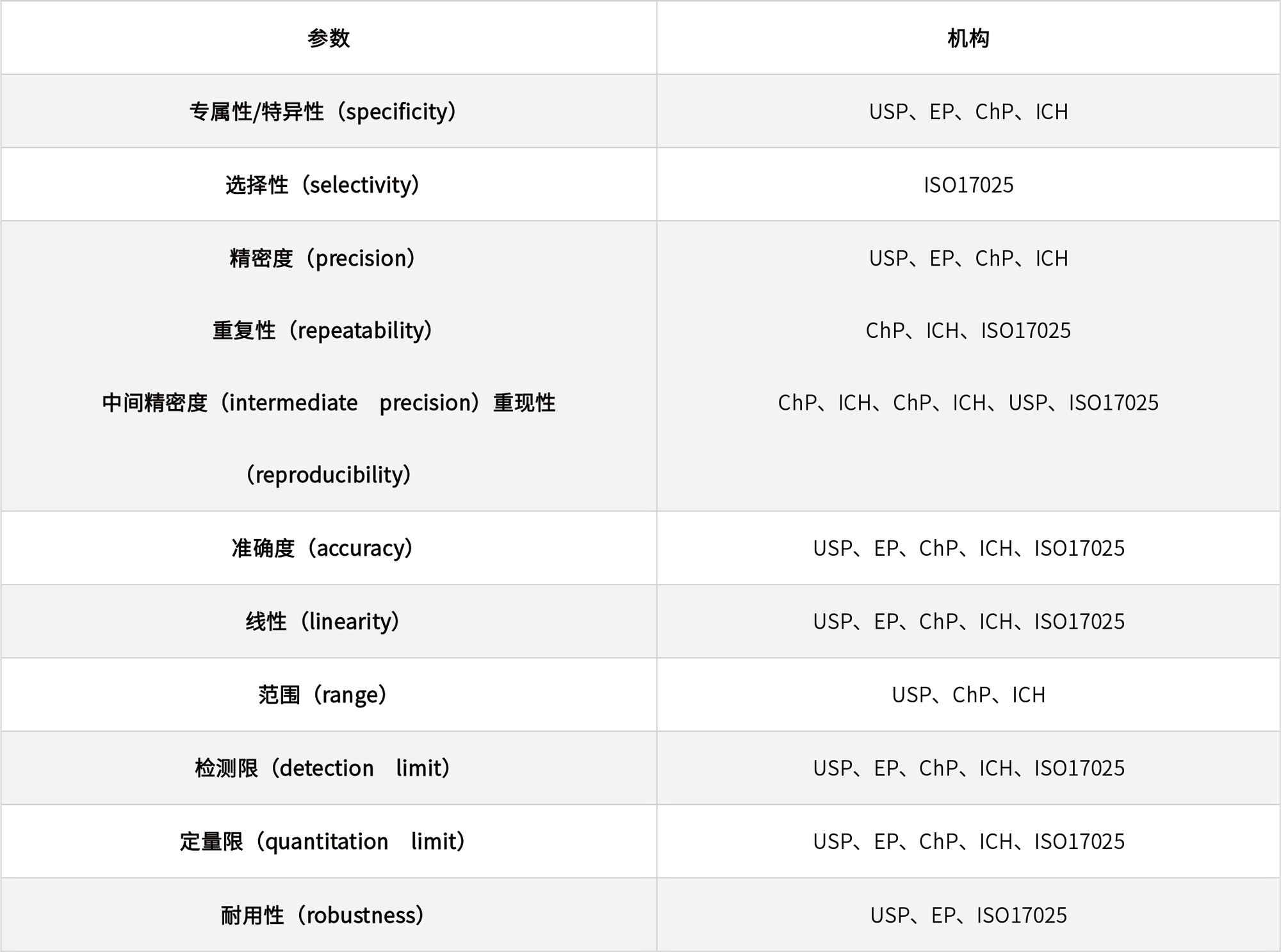 表1 不同國際組織和藥典要求的方法學驗證參數(shù)