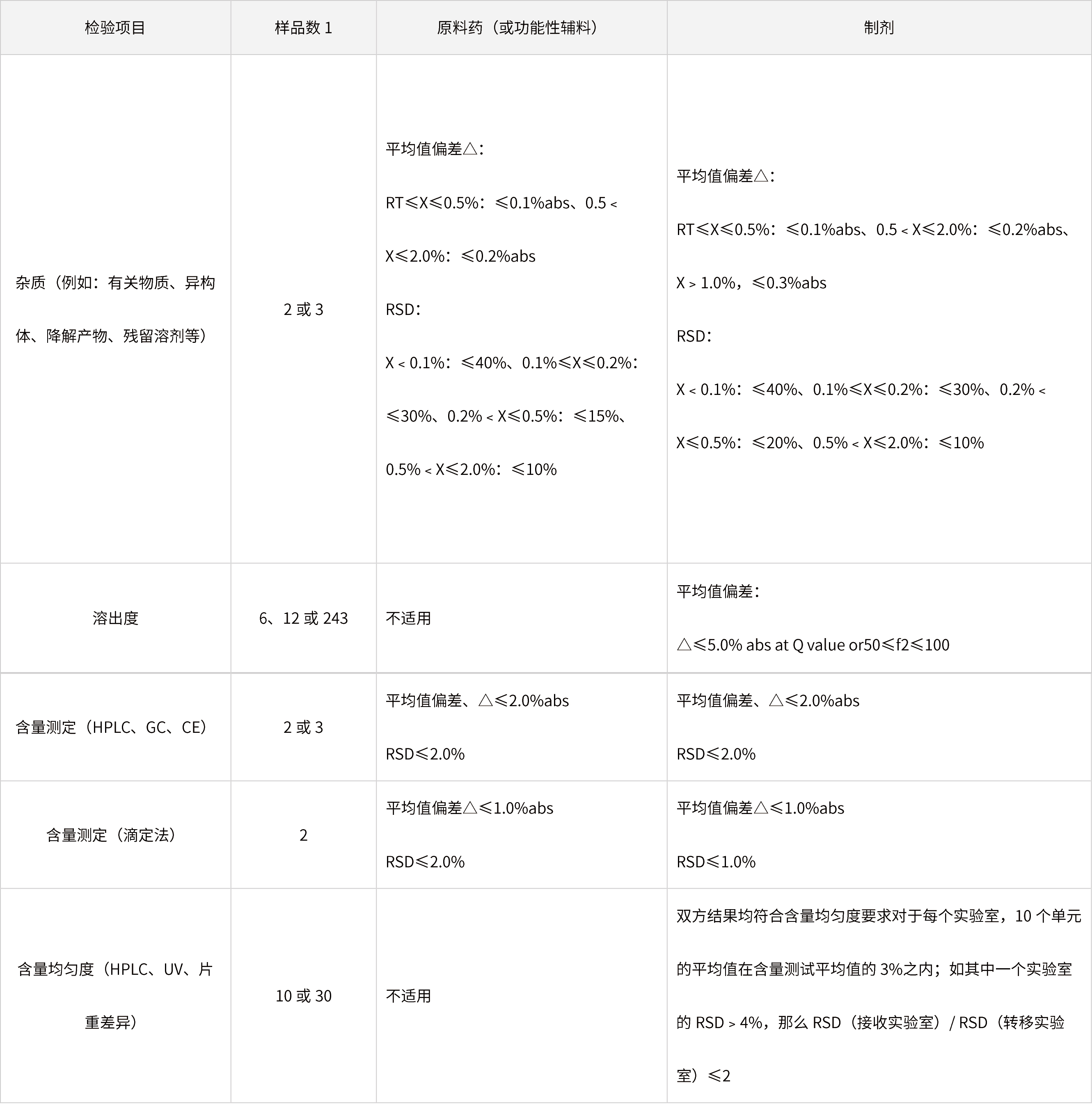 表3 通過比對試驗進行某樣品(原料或制劑)相關分析方法轉(zhuǎn)移的接收標準事例