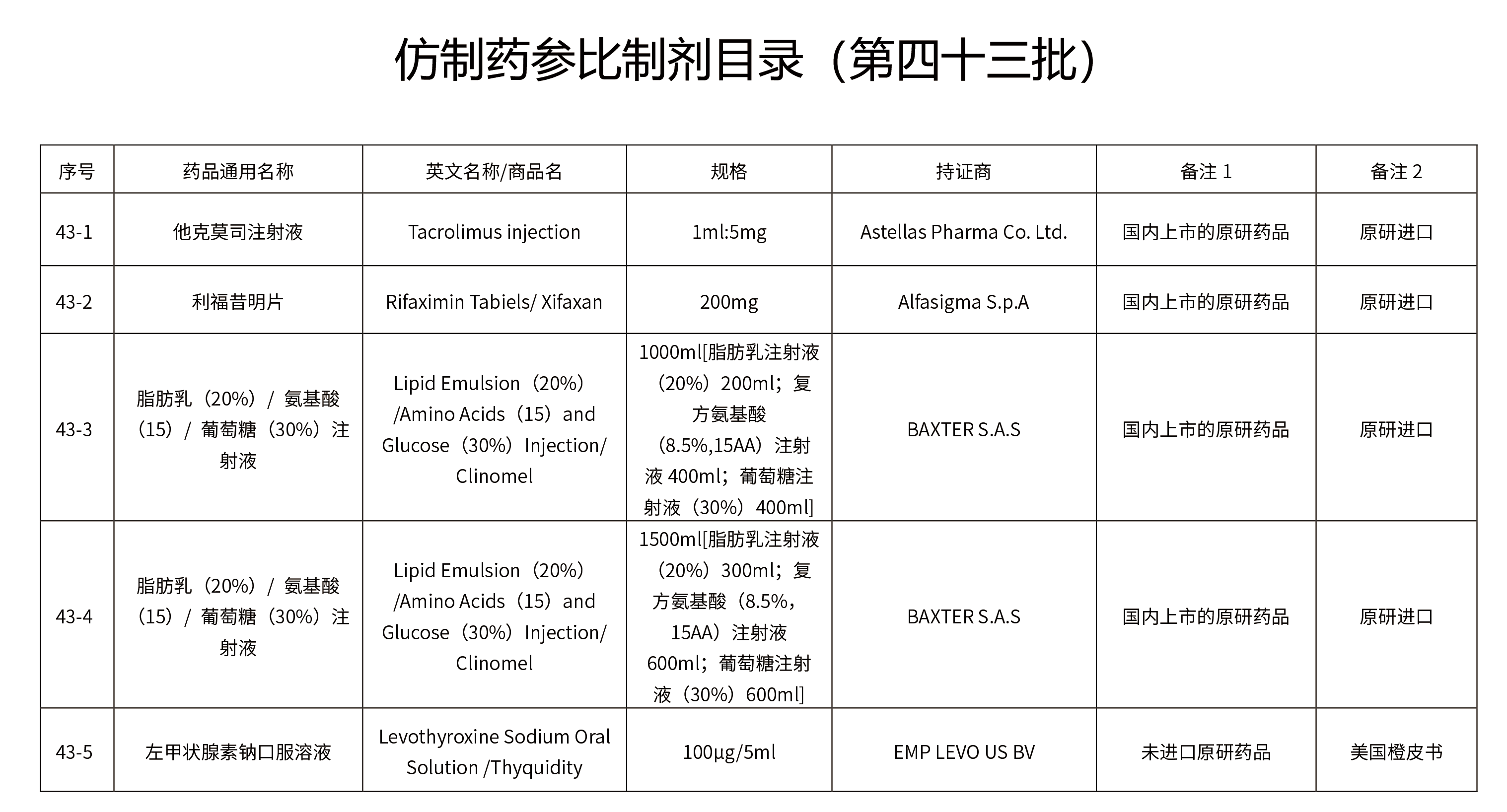 國家藥監(jiān)局關于發(fā)布仿制藥參比制劑目錄(第四十三批)的通告(2021年第51號)