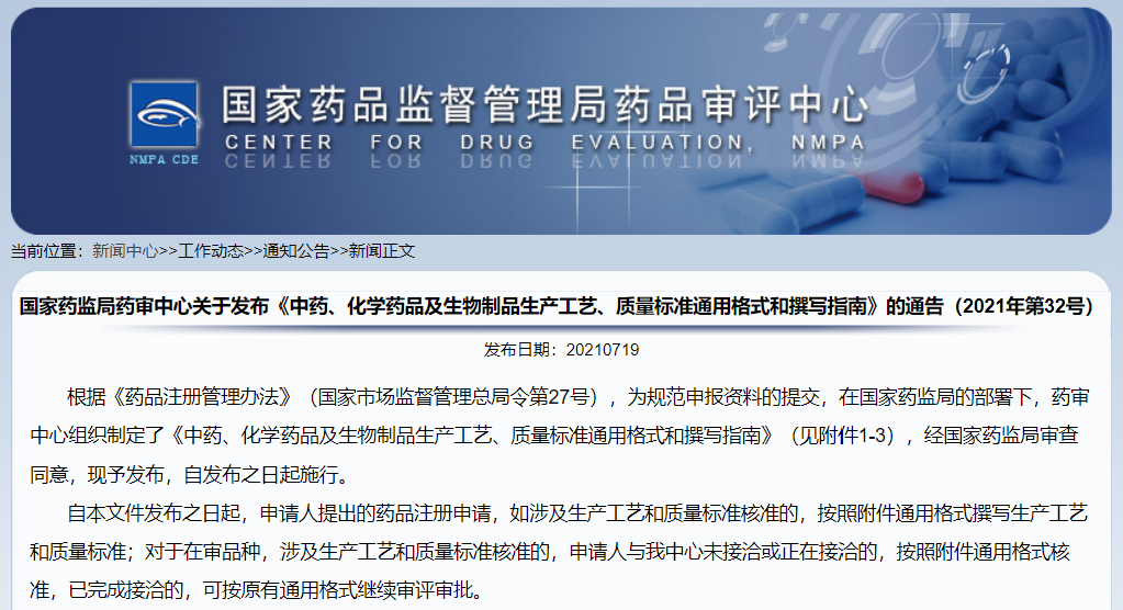 關于發(fā)布《中藥、化學藥品及生物制品生產工藝、質量標準通用格式和撰寫指南》的通告(2021年第32號)