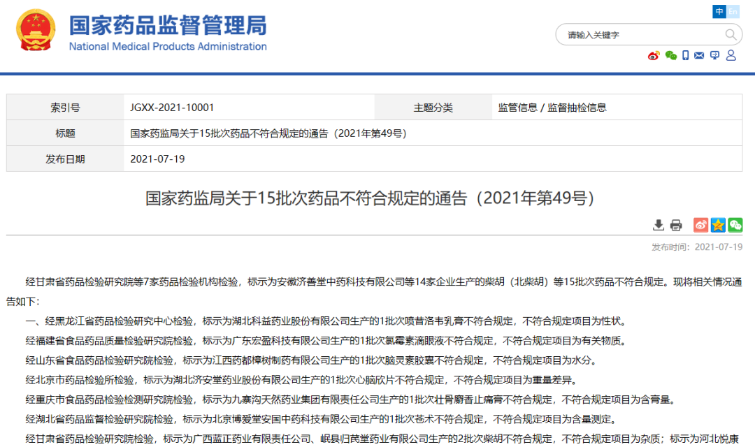 關于15批次藥品不符合規(guī)定的通告(2021年第49號)