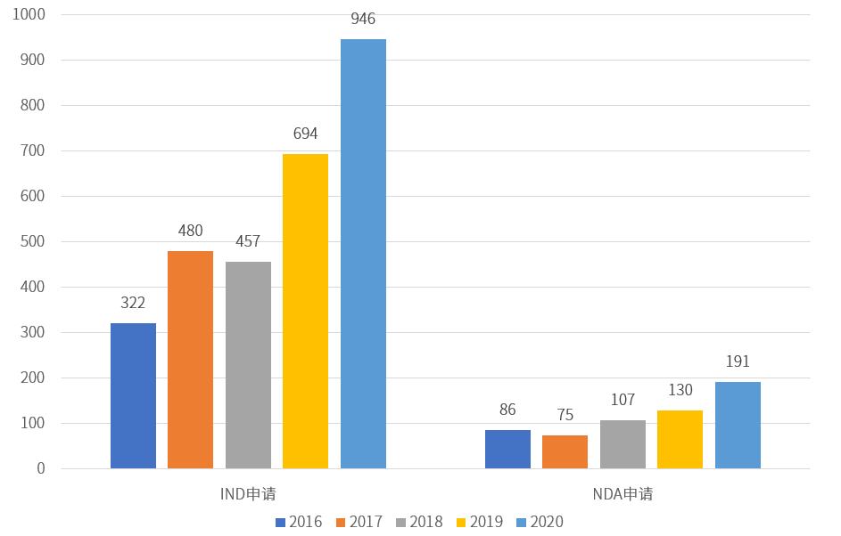 2016-2020 國內(nèi)創(chuàng)新藥IND、NDA申請數(shù)量