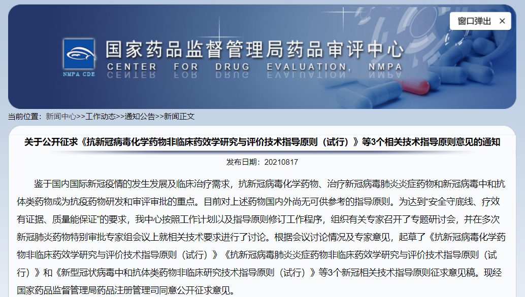 關(guān)于公開征求《抗新冠病毒化學(xué)藥物非臨床藥效學(xué)研究與評(píng)價(jià)技術(shù)指導(dǎo)原則(試行)》等3個(gè)相關(guān)技術(shù)指導(dǎo)原則意見的通知