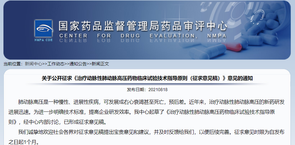 關(guān)于公開征求《治療動(dòng)脈性肺動(dòng)脈高壓藥物臨床試驗(yàn)技術(shù)指導(dǎo)原則(征求意見稿)》意見的通知