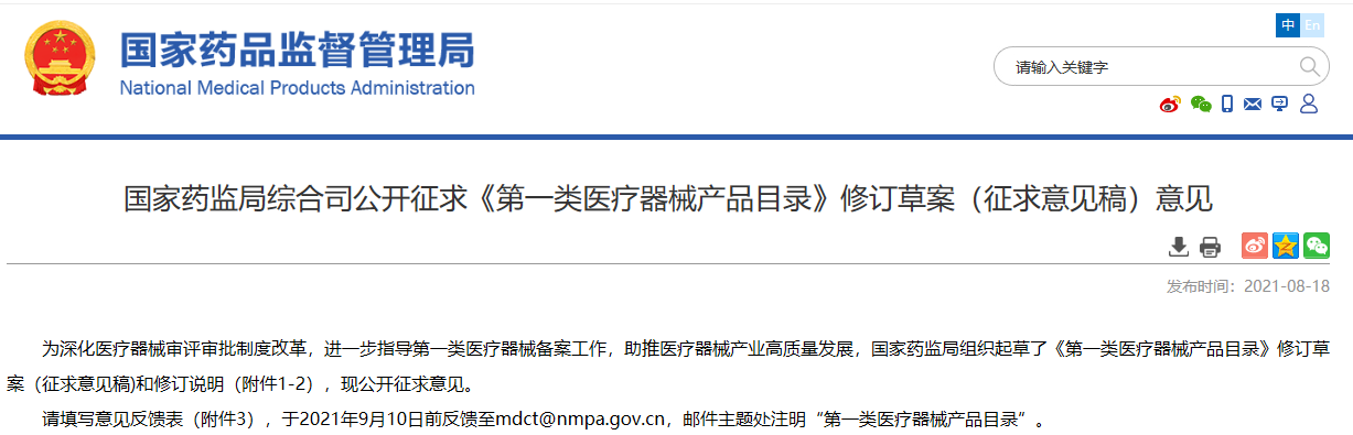 國(guó)家藥監(jiān)局綜合司公開征求《第一類醫(yī)療器械產(chǎn)品目錄》修訂草案(征求意見稿)意見