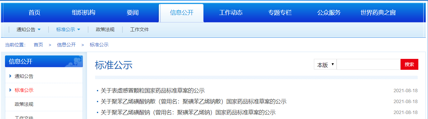 本周表虛感冒顆粒、聚苯乙烯磺酸鈉散(曾用名:聚磺苯乙烯鈉散)、聚苯乙烯磺酸鈉(曾用名:聚磺苯乙烯鈉)國(guó)家藥品標(biāo)準(zhǔn)草案公示。