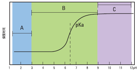 流動相pH值一般選取pKa±2范圍之外,以保障化合物處于分子狀態(tài),減少電離,此狀態(tài)下化合物疏水性較強(qiáng),色譜柱保留時間較長,能獲得良好的峰型。