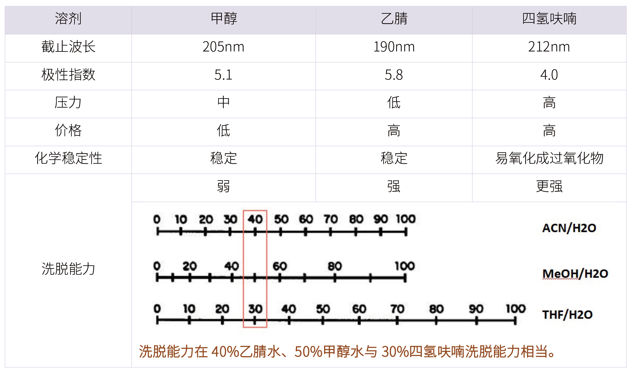 反相體系下,常用的洗脫劑為甲醇、乙腈與四氫呋喃。三種溶劑對比如下: