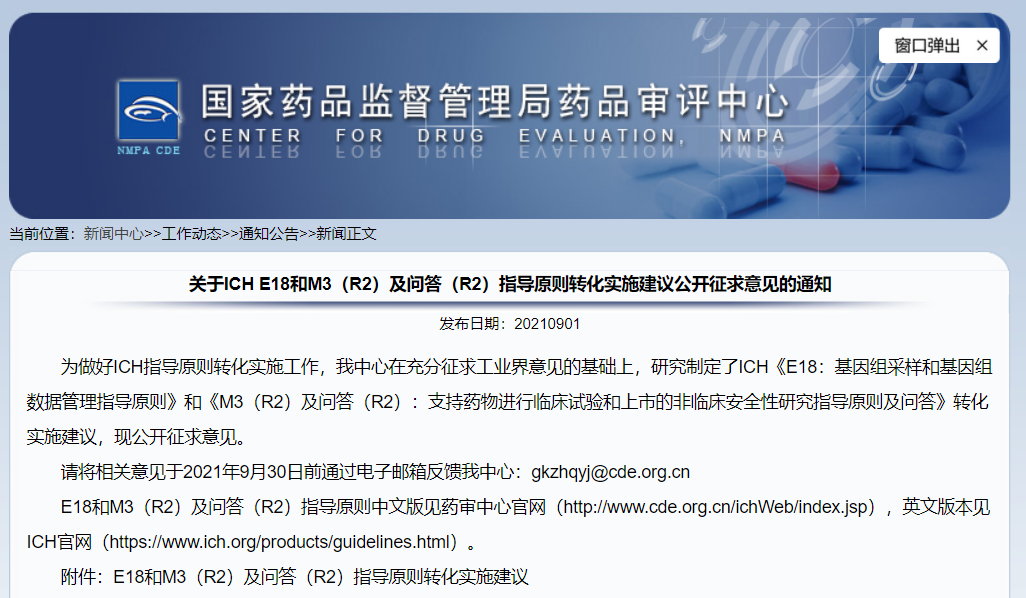 關(guān)于ICH E18和M3(R2)及問答(R2)指導(dǎo)原則轉(zhuǎn)化實施建議公開征求意見的通知
