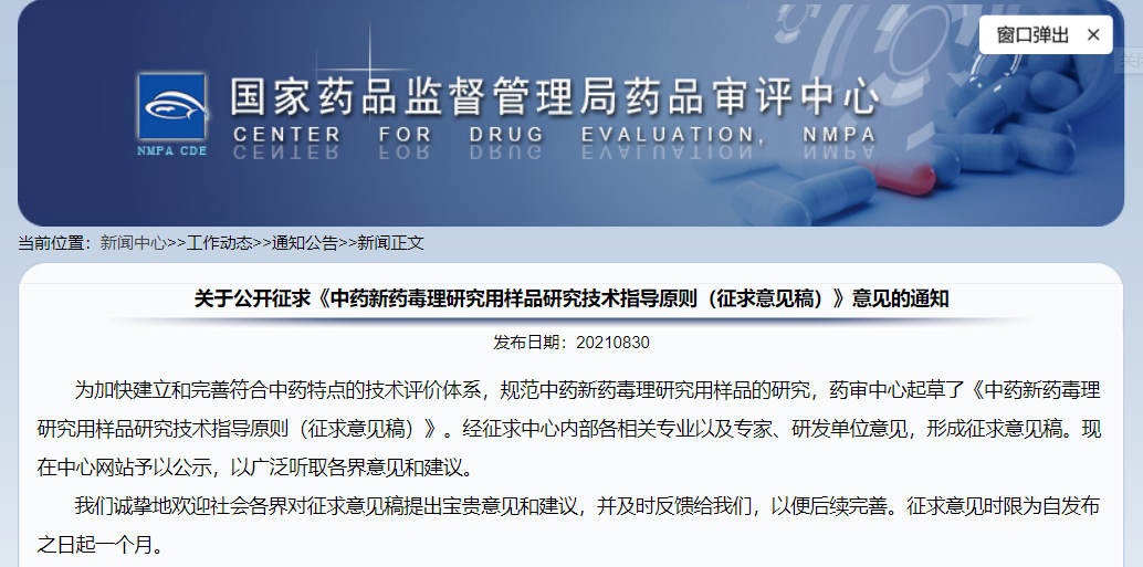 關(guān)于公開征求《中藥新藥毒理研究用樣品研究技術(shù)指導(dǎo)原則(征求意見稿)》意見的通知