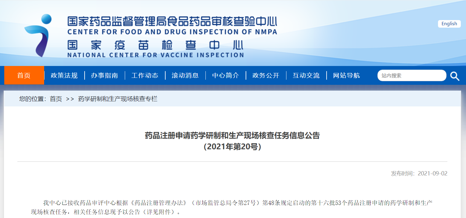 藥品注冊申請藥學(xué)研制和生產(chǎn)現(xiàn)場核查任務(wù)信息公告(2021年第20號)